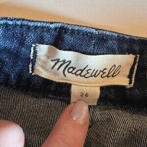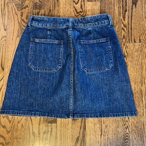 Elevate your casual wardrobe with this stylish Madewell A-line mini skirt in a dark wash denim. Crafted from a comfortable blend of 98% cotton and 2% elastane, this skirt features a flattering high-waisted silhouette, exposed zipper front closure, and four utility-inspired patch pockets—two in the front and two in the back. Perfect for pairing with a tucked-in tee or cropped sweater, this versatile skirt brings effortless cool to any outfit. Size 26.
