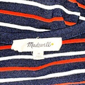Add a patriotic pop of color to your wardrobe with this Madewell Highpoint Franklin Stripe Tank Dress. The knee-length dress features a round neckline, sleeveless design, and a pullover closure. Falls 36 inches from high point of shoulder. The dress is made of a comfortable and stretchy jersey fabric, which is a blend of polyester, viscose, and cotton. The dress is machine washable, making it a practical choice for casual occasions during the summer, fall, or spring seasons. The dress is available in size M and is perfect for women who love colorful and comfortable fashion.