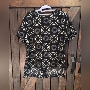 A pocket tee in a substantial textural crepe. Button-back detail and higher-in-front hem, this boxy-cool top can do the office-to-after thing.