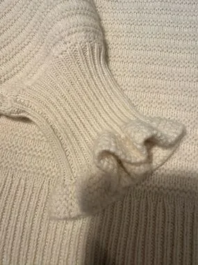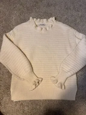 Soft ribbed knit with subtle horizontal texture. Ruffle trim at neck and cuffs. Comfortable relaxed fit for layering. Versatile ivory shade pairs easily with neutrals.