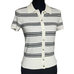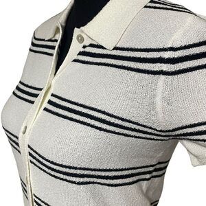 Features and details: stretch, textured sweater material, light to medium weight, short sleeves, button front closure, collared, striped design all over, ribed cuffs