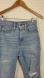 Gently worn with intentional distressing at front and a repaired distress patch on back thigh. Light wash fading and raw hems are design features. Fabric is clean and intact; zipper and button work properly.