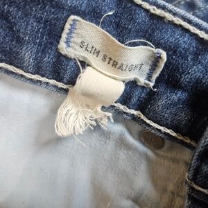 Features: Five-pocket design; zip fly with branded button closure; leather back waist patch; stretch denim for comfort; slim straight leg; frayed/raw-cut hems