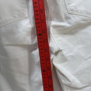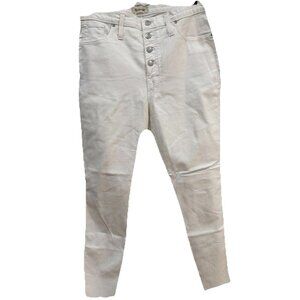 This Madewell jeans is a women's size 31 with a high rise of 10 inches, featuring a skinny crop style in white denim. The jeans have a button fly and a 5-pocket design with a slim fit. Made from a cotton blend fabric with a light wash, they are suitable for all seasons and have a casual, preppy look. Perfect for a bohemian or city-inspired ensemble, these Madewell jeans are a stylish addition to any wardrobe.