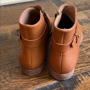 A cool collar-stud strap and ankle-flattering crossover detail give these flat leather ankle boots a leg up on the competition. An inside zipper means off-and-on is no sweat. Cushiness alert: We've added an extra layer of padding to make them even easier on the feet.