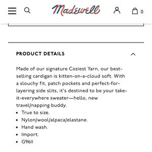 Madewell classic Kent cardigan in super soft wool and alpaca blend. Two front pockets and slight stretch. Warm golden yellow color. Total length from shoulder to hem approximately 33”. Please see photos for additional details. 💕