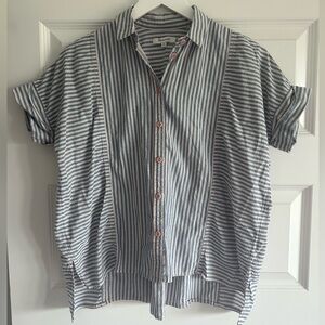 With its flowy fit and laid-back vibe, this button-up shirt is made for sunnier days (we love the mix of stripes). Easy banded sleeves and side slits make it just so breezy.