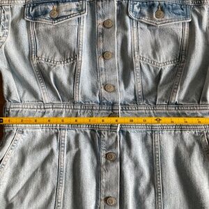 Sleeveless denim dress. Button-down front. Classic collar. Casual and stylish.