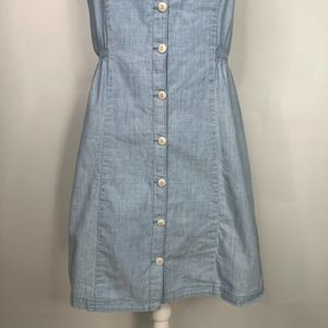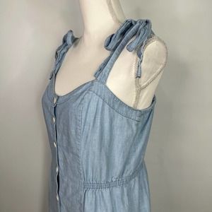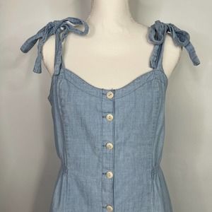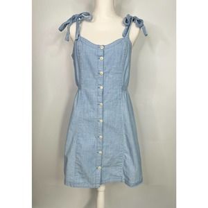 Chic mini dress with button front. Features tie straps. Perfect for casual outings.