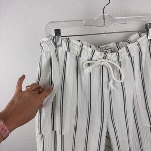 Double-layered gauze cotton, white with green stripes, pull-on styling, elastic + drawstring waist, pockets, cropped, size medium.