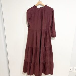 own, this midi is made from our supersoft Lightspun double gauze. Ruffle details at the neck and cuffs plus a tiered skirt give it an elevated feel.