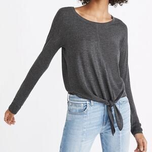 Small Madewell sweater. Lightweight, grey knit fabric. Soft and stretchy. Center seam with tie-front knot detail. Drop sleeves. Great condition!