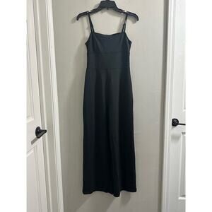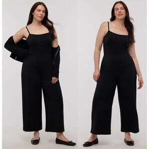 The fabric: sleek and structured, this ponte is polished enough to dress up or down. The fit: an easy square-neck jumpsuit with adjustable spaghetti straps and straight legs.