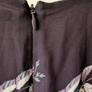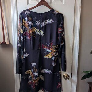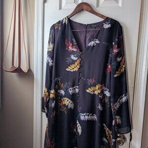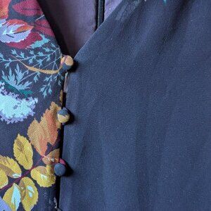 of vintage-inspired details like sheer sleeves, a V-neck, a dramatic floral print and tiny covered buttons. A piece that can easily go from work to party mode.