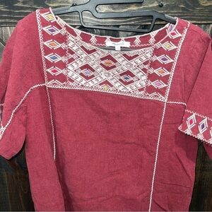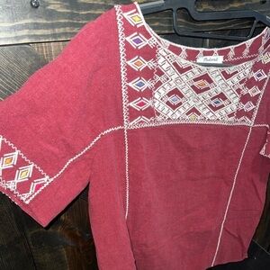 Madewell brand crop length top. Size small. Embroidery details. Linen blend tee. Burgundy with pops of color in the tribal designs. Size small. Bohemian vibes. Super cute top. Casual. Preloved. Please see all photos for condition. Boxy, slightly oversized fit.