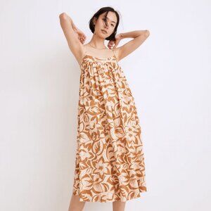 Madewell Linen-Blend Cami Midi Dress in Tropicale Floral - Size Small. Made of an airy (and eco-friendly) linen blend in a bold tropical print, this cami midi dress has oversized patch pockets in front and a peekaboo back. Cut with a free and easy fit, it's perfect for those superhot, humid days when you don't want any thing touching you. Fabric is 55% linen / 45% Lenzing™ Ecovero™ viscose. Adjustable straps. Falls 48" from high point of shoulder. Oversized fit. Unlined. Color is called tawny sand - light and dark golden tan tones. EUC, no stains or signs of wear. Comes from a non-smoking home.