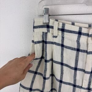 Textured cotton & linen blend, cream with navy blue windowpane stripes, high rise, pleated front, pockets, belt loops, size 2.