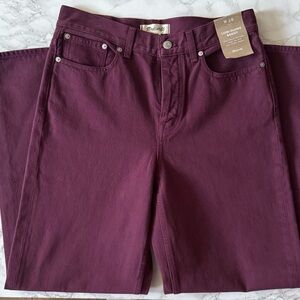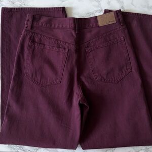 Madewell Low Slung Baggy Jeans in Bordeaux a ‘garment dyed’ burgundy denim, size 26. High rise (that can also be worn low on the waist) wide leg jeans with button fly. In great condition, garment dyed fabrics have some natural color variations. $148 retail, current style online.