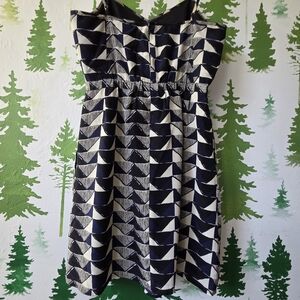 The dress features a geometric pattern in blue, black, and white colors, with a V-neckline. It has a zip closure and comes with pockets, making it perfect for casual wear.