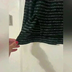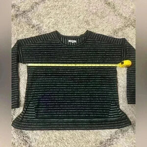 A heavier weight material, this is a high quality sweater that's not too thin or thick! Stripes; Slouchy shoulder on sleeves; Fitted in arms but oversized in the body of the sweater. High low hem. Perfect for layering or wearing as is!