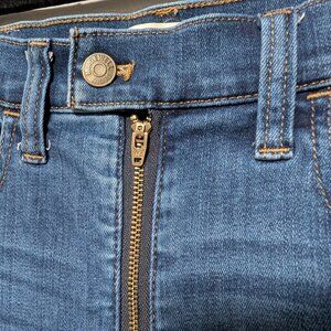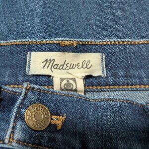 Madewell 10" Roadtripper styled skinny jeans in a medium wash. Features an exposed front zipper for a modern, edgy twist. "M" stitched on the corner of the right back pocket.