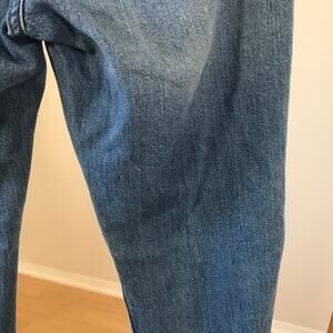Features: Medium wash jeans with a straight leg fit, factory fading and whiskering