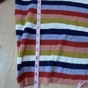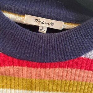 Madewell small multi colored striped sweater is a stylish and versatile addition to any woman's wardrobe. Featuring a colorful striped pattern with a crew neck and long sleeves, this tight-knit sweater is made from a wool blend material for comfort and warmth. With a regular fit and pullover style, this sweater is lightweight, stretchy, and breathable, making it perfect for all seasons. Machine washable and in a size small, this Madewell sweater is a fashionable choice for any occasion.