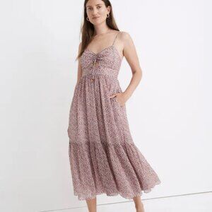 As defined by the brand: Seersucker Keyhole Tiered Midi Dress in Cottage Garden. Color Pale Lilac. Smocked in back for the perfect fit, this tiered seersucker midi dress has a subtle keyhole cutout in front below a ruched bodice with adjustable bead-trimmed ties. With a cute floral print, it's perfect for all those weekend events you have coming up. Falls appr. 50" from high point of shoulder (straps are adjustable), polyester/elastomultiester, machine wash. Lined.