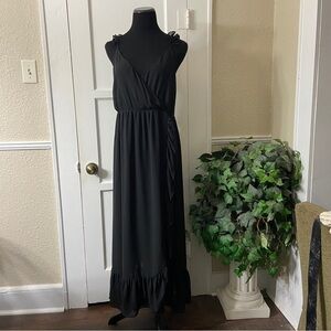 Black, fully lined, frilly straps, plunging neckline. Very feminine, special occasion, boho. Excellent pre-owned condition. Armpit to armpit 20”, upper waistband 17”, length 55 1/2”.