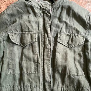 Military style jacket. Flap pockets. Hood. Waist drawstring. Linen cotton blend.