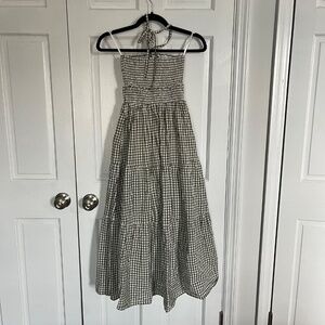 We love a three-fer, especially in yarn-dyed gingham cotton poplin. This bralette/skirt combo buttons together into the perfect summer midi dress with a halter strap at the sweetheart neckline, flirty front cutout and flowy tiered skirt.