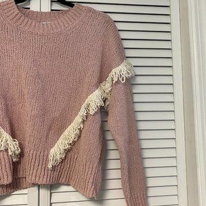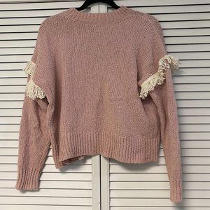 Madewell Montford Fringe Pullover Sweater. Very cute knit sweater that is a blush / rose pink color with contrasting white / cream fringe that runs like a V-shape.