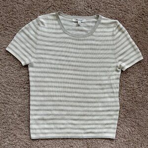 Madewell striped sweater tee XXS, Madewell ribbed crop top, Madewell Monument stripe shirt, Madewell semi-sheer rib tee, Madewell fitted striped tee, Madewell ribbed cropped shirt, Madewell short sleeve sweater tee, women’s Madewell striped crop top, Madewell lightweight ribbed shirt, Madewell micro-rib knit top, Madewell white gray stripe top, minimalist striped crop tee, 90s style striped crop top, Madewell high-rise crop tee, Madewell versatile