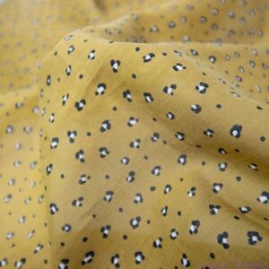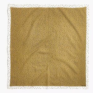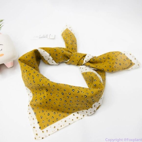 Stylish mustard scarf with white border. Features small floral pattern. Perfect for any outfit. Wear it as a kerchief, tie it onto a tote, wrap it around your wrist.