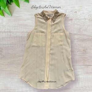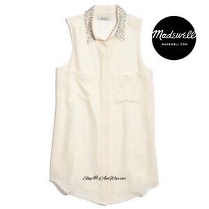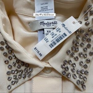 Madewell NWT cream sheer sleeveless blouse with gorgeous rhinestone embellished fold down collar & button front closure. Please note: listing is for cream only! This would also make a basic crewneck sweater pop, layered underneath. Retailed at $115. Size xs, see photos for measurements.