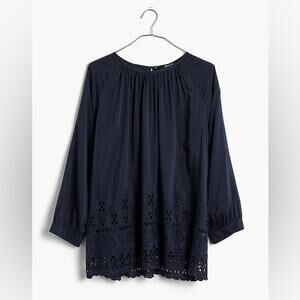 Madewell Navy Blue Eyelet Edge Shirred Peasant Blouse Size Small