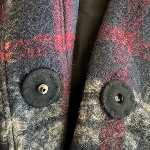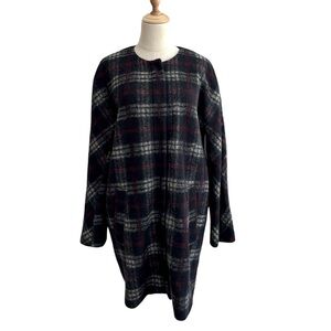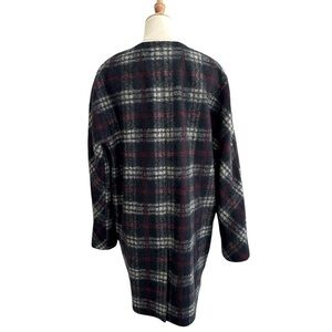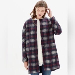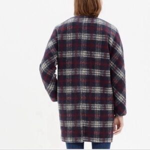 Madewell Navy and Red Brushed Plaid Soft Wool Blend Woman's Estate Coat Size 10 in like new condition. This soft wool blend estate coat is a pretty navy plaid with red and gray pops. It has a hidden snap closure on the front with two side slant front pockets and is collarless. The back has a small slit and it is fully lined. It has a nice weight to it, not too heavy and is loose fitting. Measurements lying flat are approximately 23” inches underarm to underarm and from shoulder to hem approximately 33 ½”. Great coat ♥️