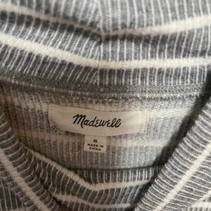 Madewell Note Funnel Neck Pullover. White and gray striped top. Ribbed terry fabric. Funnelneck. Wide sleeves. Boxy relaxed fit. 100% Cotton.