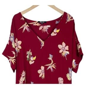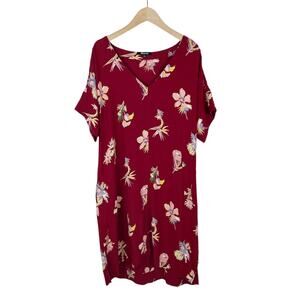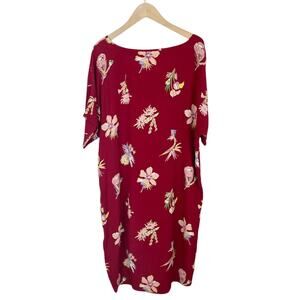 This drapey v-neck shift dress is an easy pop on style that you can wear anywhere. Hawaiian inspired floral print. Color is Tropical Floral Deep Crimson. 100% viscose.