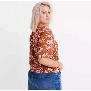 This Madewell blouse features a rust brown color with a hillside daisies pattern on a lightweight rayon fabric. It has a casual sleeve style, short sleeves, and a V-neckline with a tie front closure. The blouse also has a regular fit and comes in size M, perfect for a casual occasion. The blouse is a novelty-themed top with a floral pattern and the daisy character. It is suitable for women and belongs to the clothing, shoes, and accessories category.