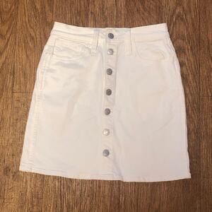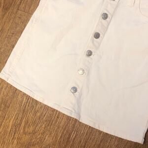 • Other information: Off white denim mini skirt. Straight shape. Silver button closure down the front of the skirt. Five pockets and belt loops present. Minor stretch. Machine washable.