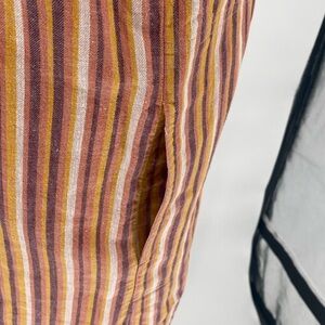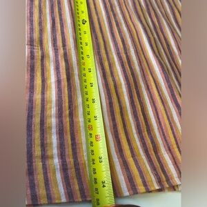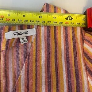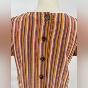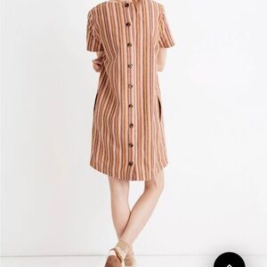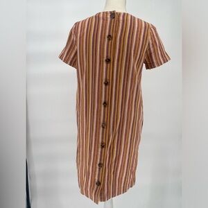 This casual sheath dress by Madewell features a flattering V-neckline and short sleeves, perfect for warm weather. The dress showcases a harmonious blend of orange and brown tones in a vertical stripe pattern, offering a stylish yet relaxed look. Its midi length and lightweight fabric make it an ideal choice for everyday wear.