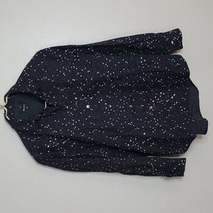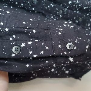 Button front. Star print. Oversized. Long sleeve with button cuffs. Cotton. Longer in back for extra coverage.