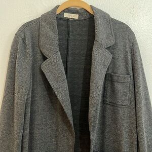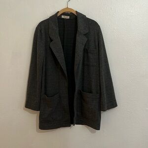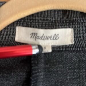 Very subtle grey plaid Madewell open front jacket with lapels and 2 large patch pockets 1 small breast pocket and back vent. I would say this jacket is over sized based on measurements