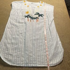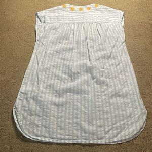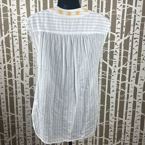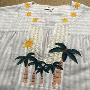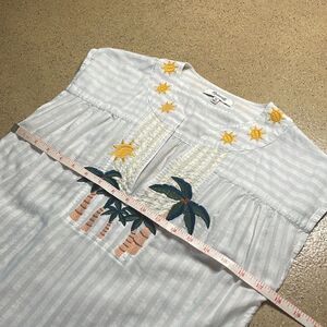 Madewell Palm Tree Sunshine Embroidered Blue White Striped Sleeveless Top. Features lightweight breathable semi-sheer cotton lyocell blend in a white and light blue vertical stripe, curved split hemline, V-Neck with happy sunshines and palm trees embroidered around the chest and neckline. Gently worn and laundered with no flaws to note. See pics for measurements. This is such a fun summer piece - it's absolutely adorable!!