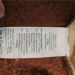 Super soft sweater. Made of merino wool and alpha, plus other materials. So soft and warm. Has piling. see pics but due to type of materials it's common. Tag says size xs.