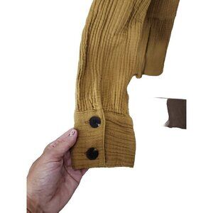 This Madewell blouse is a versatile addition to any wardrobe. The long sleeve top features a round neckline with button closure and a peplum hemline with ruffle accents. The solid dark mustard color is perfect for any season and the 100% cotton material ensures comfort. The blouse is pre-owned but in great condition, ready for its next owner to enjoy. Ideal for any occasion, this regular fit blouse is a must-have for women who love basic yet stylish clothing. Made in Vietnam, this Madewell top is perfect for those who appreciate quality and fashion.