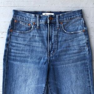 Madewell The Perfect Vintage Crop Jeans in Cassie Wash, which is a medium wash with factory fading and whiskering and distressed hems. High waist, straight leg, cropped/ankle length. The denim has some stretch. Good used condition, with some light puckering at the center seam (please see pics). Otherwise perfect. Size 27.