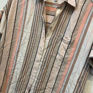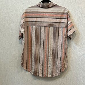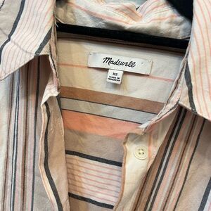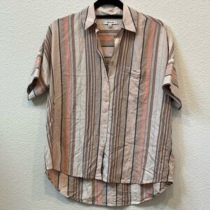 This Madewell top features a relaxed, boxy fit with a notched collar and button-down style. The shirt showcases a blend of pink and tan hues, offering a chic and versatile look. Ideal for casual outings, its lightweight fabric ensures comfort throughout the day.