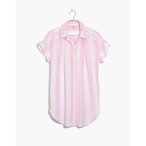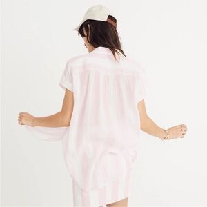 Chic button-down shirt with pink and white stripes. Short sleeves and classic collar. Perfect for casual wear.